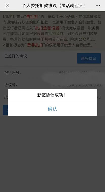 新签协议成功,点击“确认”。新签协议默认为“费批扣”协议。