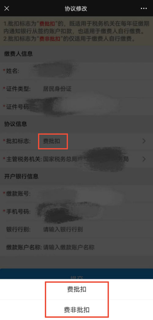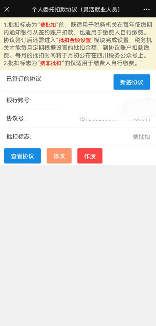 如不参加批扣缴费,请点击“修改”,修改“批扣标志”为“费非批扣”,或直接“作废”协议。