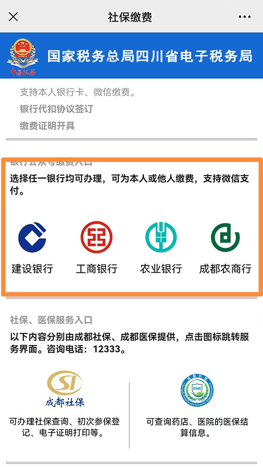 在【社保缴费】“银行公众号缴费入口”,选择任意银行均可缴费,支持微信、银行卡等多种支付方式,具体以银行提供为准。
