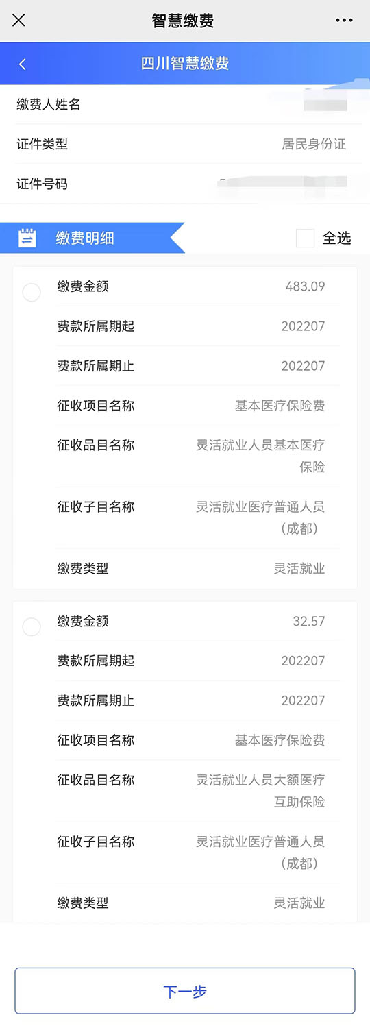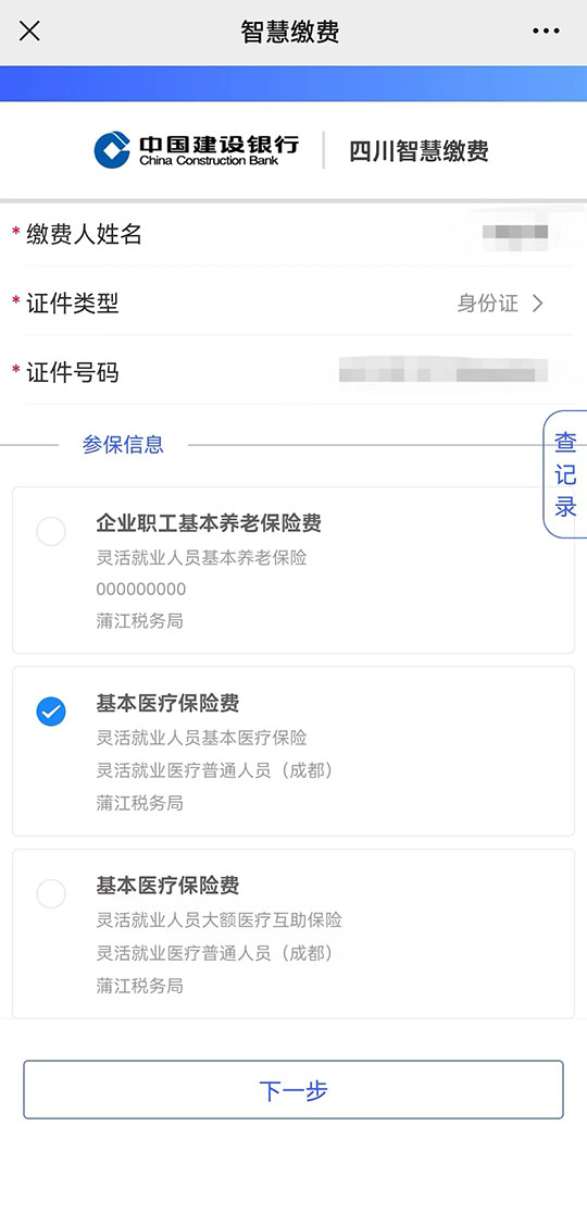 输入“缴费人姓名”、选择“证件类型”,输入“证件号码”,勾选缴费险种,点击“下一步”。