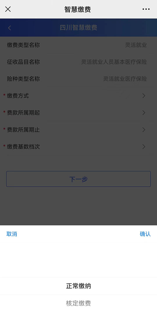 选择缴费方式为“正常缴纳”、费款所属期起、费款所属期止、缴费基数档次,点击“下一步”。