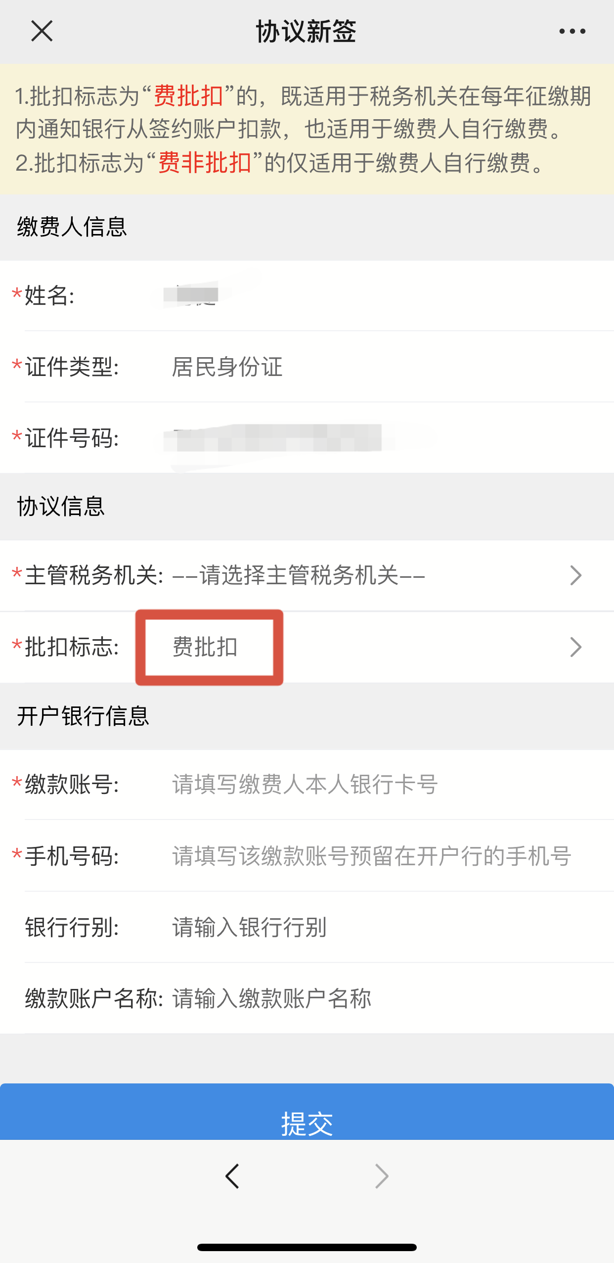 根据参保所在地,选择“主管税务机关”,填写缴款账号、银行预留手机号码,点击“提交”。