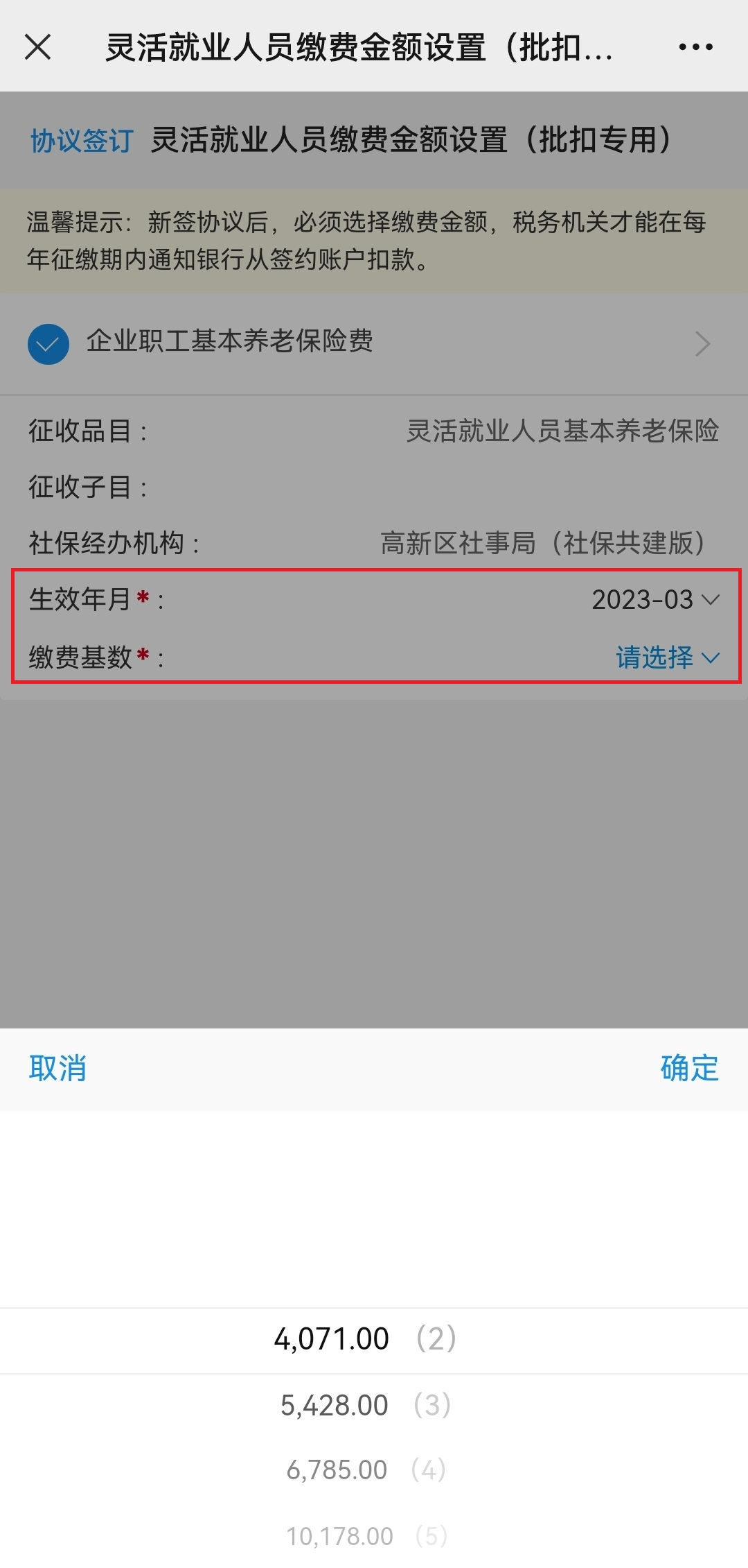 1.若您在参保地主管税务机关存在有效批扣协议,您通过电子税务局或银行渠道的“是否重新确认缴费基数”项勾选“是”,则选择确认的缴费基数(档次)将用于税务部门按月批量扣费。