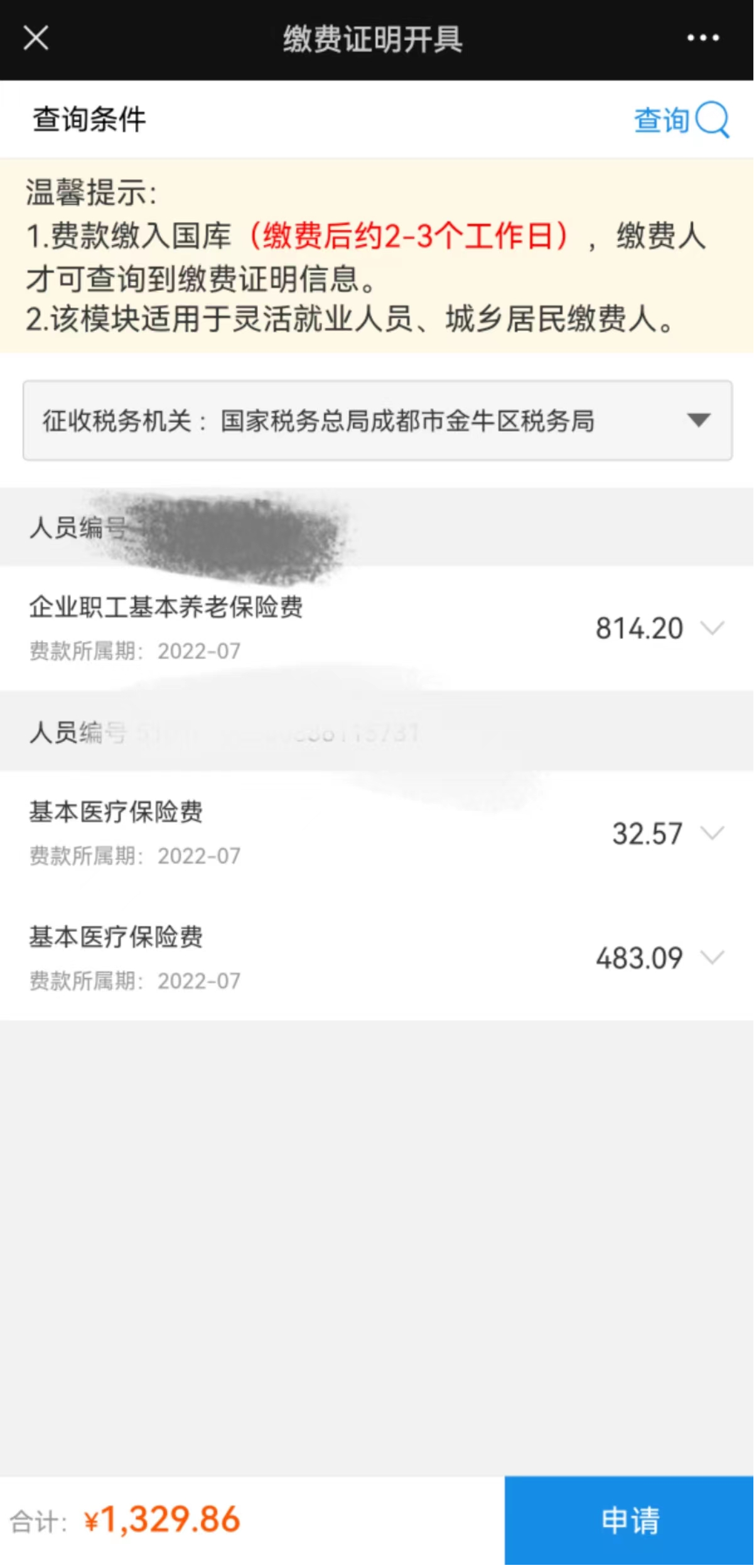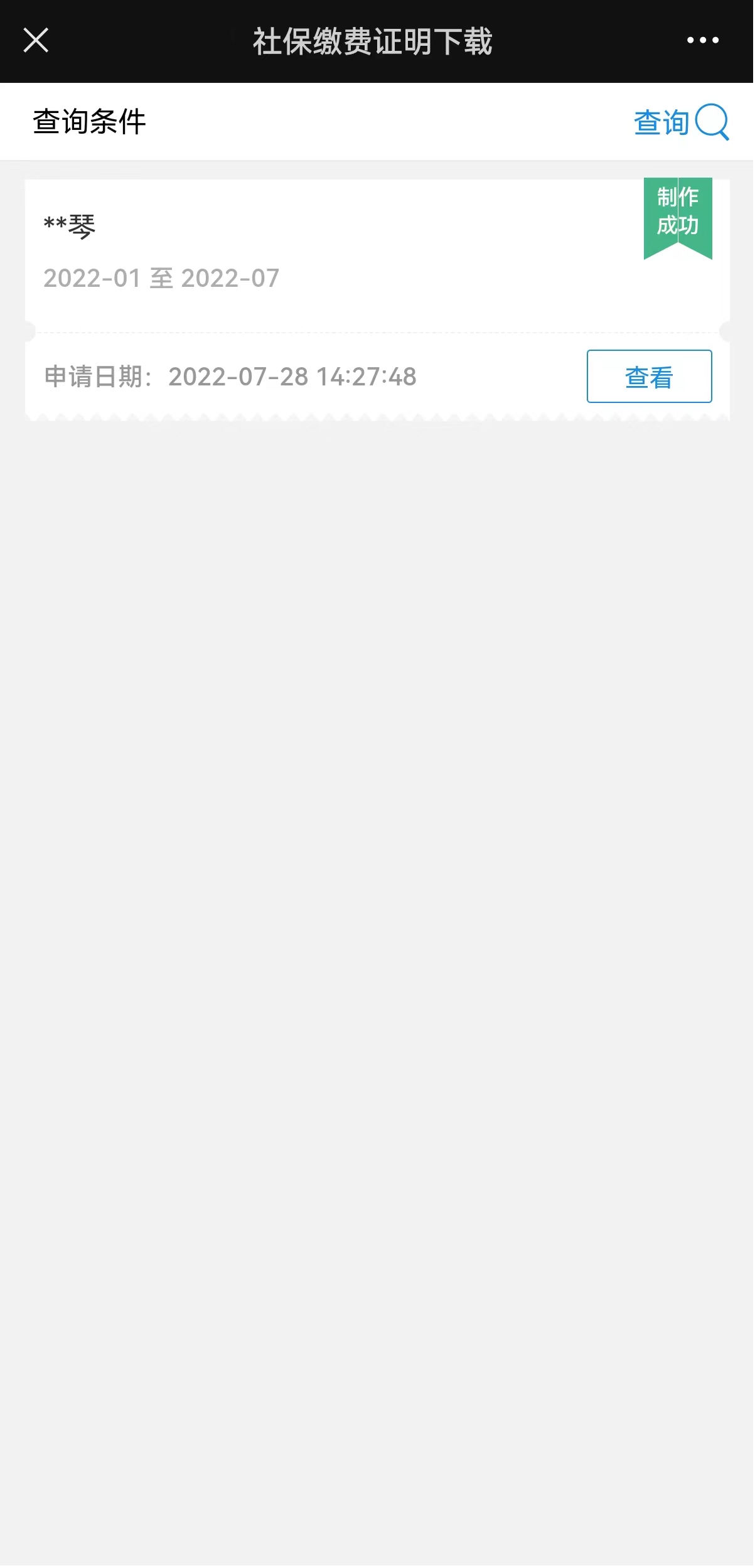 点击“申请”开具缴费证明;点击“查询”显示制作成功的缴费证明列表;点击“查看”,显示格式化缴费证明。